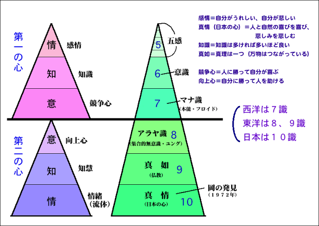 「第一の心」とは「有(う)」であり、意識を通して言葉で現される。「第二の心」とは「無(む)」であり、決して意識を通さず、言葉でも書けない。「無」が根底にあるから、「有」が有り得る。真、善、美はすべてその源を無の世界に発して、有の世界へ流れこんでいる。有の世界に入って後、言葉で云えるのである。