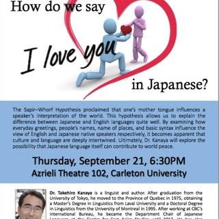 <2017年9月21日にオタワの在カナダ日本大使館の主催による文法講演会に講師として招かれました。会場は日本語教育が高い評価を受けているカールトン大学。「効果的な日本語教育法」と題したワークショップで私も数年にわたって何度か講師を勤めた大学です。講演のタイトルは『日本語で<アイラブユー>をどう言うか』として、述語制言語である日本語を、主語制言語の英語を比べながら対照的に紹介しました。日頃あまり使っていない英語での講演でしたが、幸い何とか勤めることが出来ました。以下、当日の心の高まりを思い出しながら、講演内容を日本語に訳しながら振り返りたいと思います>
