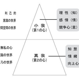 岡はここで初めて仏教の真我、小我を持ちだしてきている。仏教は漠然とこういう二極対立を考えているようだが、「仏教はそういえばいいところを、そういわんから人にわかりにくいんだね」と岡がいうように、真我、小我をはっきり提唱している仏教の宗派は以外と少ないように思う。だから、岡がこの構想を持ちだしてきたのは、やはり光明主義からではないだろうか。