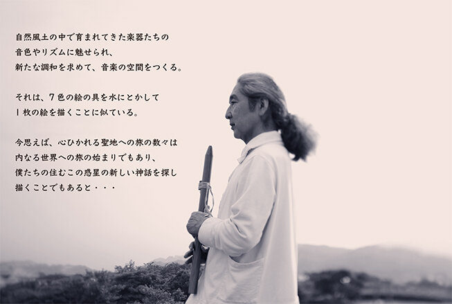 以後インディアン・フルート、バンブーフルートを中心に民族楽器の音色を生かす楽曲作りを重ね、最近作「Jomon Journey」にいたる 17作のアルバムをリリース。国内外で演奏活動をしている。